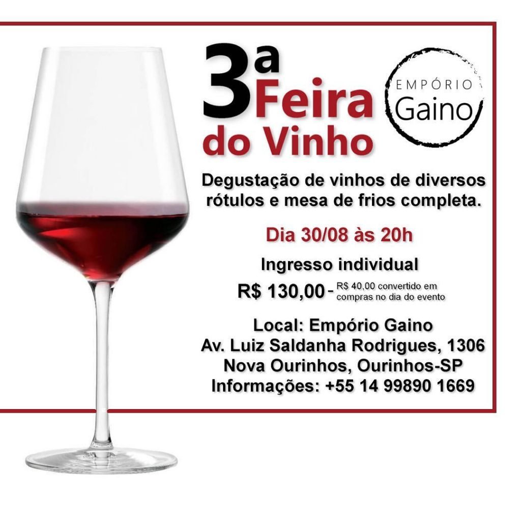 Garanta já a sua presença na 3ª edição da feira do vinho, são vinhos de diversos rótulos para serem degustados e mesa de frios completa! O evento será no piso superior do Empório Gaino, situado na Avenida Luiz Saldanha Rodrigues, 1306, Nova Ourinhos, 19907-510.