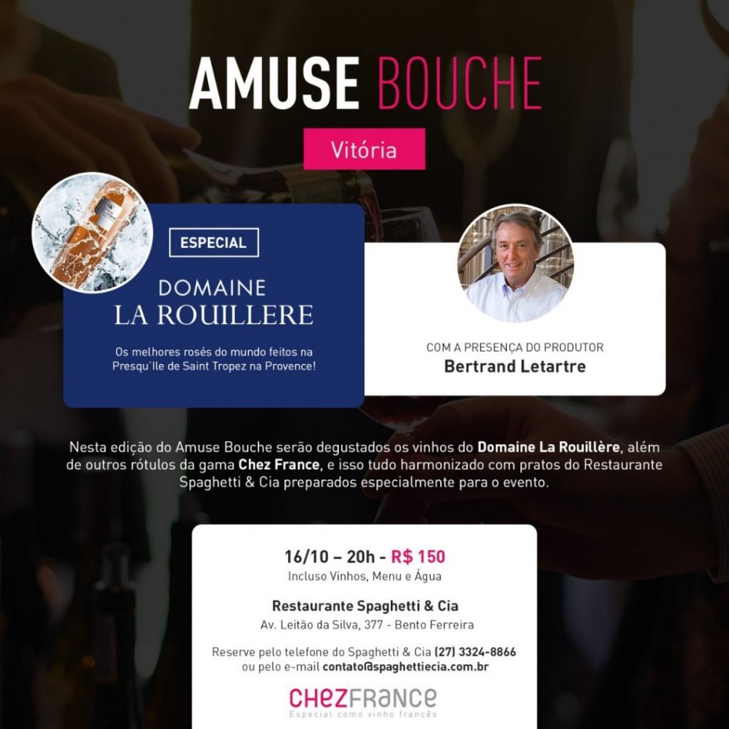 A 4ª edição do Amuse-Bouche, o nosso jantar harmonizado em parceria com a @chezfrancebr, vai acontecer no Spaghetti Vitória! No dia 16/10 (quarta-feira), teremos um delicioso menu degustação em 6 etapas para harmonizar com os vinhos da importadora francesa (1 amouse-bouche, 2 entradas, 2 pratos principais e 1 sobremesa).