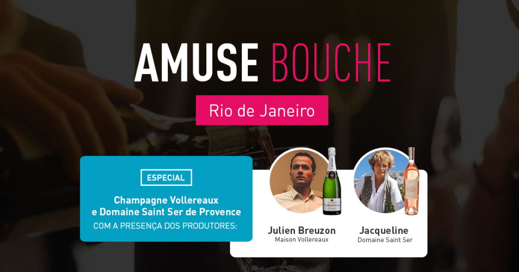 Nesta edição do Amuse Bouche teremos a presença dos produtores Julien Breuzon, da produtora de Champagne, a Maison Vollereaux e da Jacqueline Guichot, do Domaine Saint Ser de Provence. Serão degustados os novos Champagnes da Maison Vollereaux, vinhos orgânicos e biodinâmicos do Domaine Saint Ser além de outros rótulos da gama Chez France. Tudo isso harmonizado com um menu volante preparado especialmente para o evento pelo Francês Restaurante.