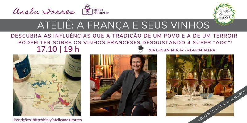 Dia 17/10/2019, a Casa do Sentir receberá a sommeliére Analu Torres, que ministrará aula e degustação sobre vinhos franceses.