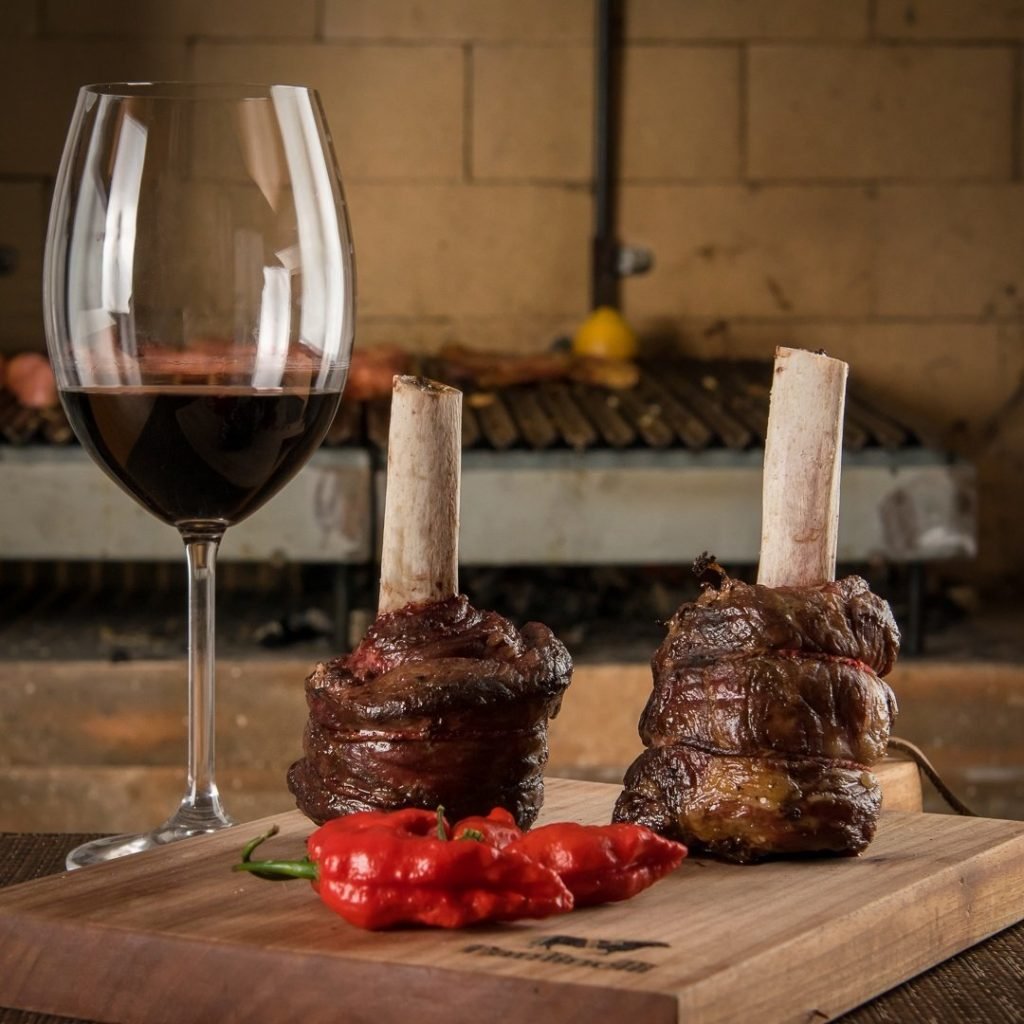 Entrada: Linguiças artesanais Paulinelli assadas na parrilla com farofa de baguete com o vinho tinto argentino Qué Guapo Malbec Blend 2017.
