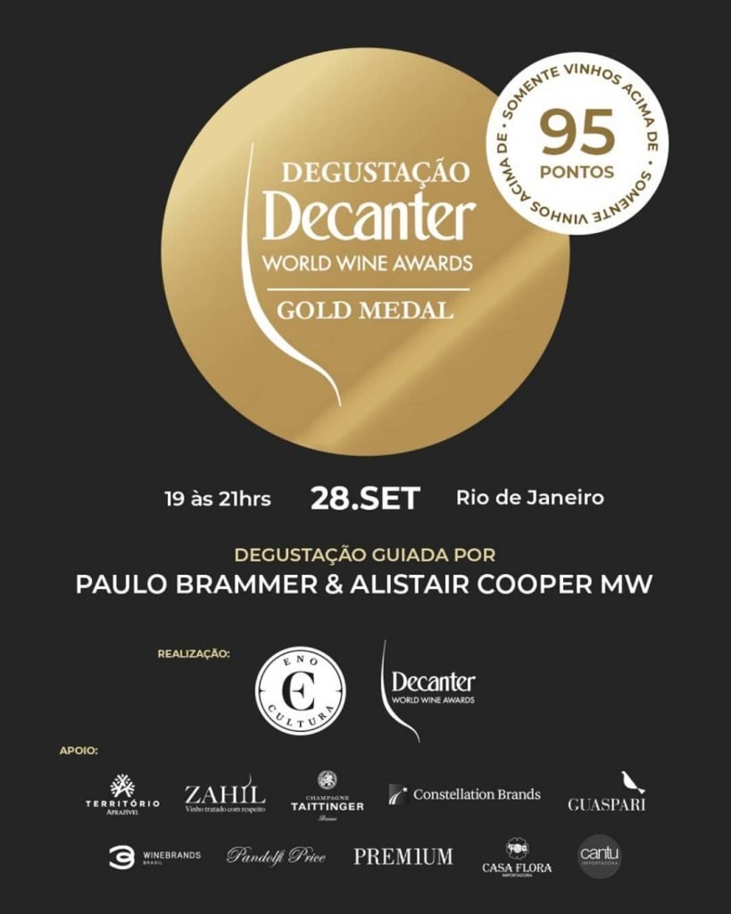 A Eno Cultura em parceria com a revista inglesa Decanter, fará um evento inédito no Rio de Janeiro onde serão degustados vinhos com classificação Gold Medal (acima de 95 pontos) dos últimos 10 anos da maior competição de vinhos do mundo, a Decanter World Wine Awards. A degustação será guiada pelos jurados da competição o nosso diretor Paulo Brammer e o Master of Wine Alistair Cooper. A degustação terá vinhos de 2009 a 2019, identificando as influências do clima e evolução em suas diferentes safras – método vertical da técnica.