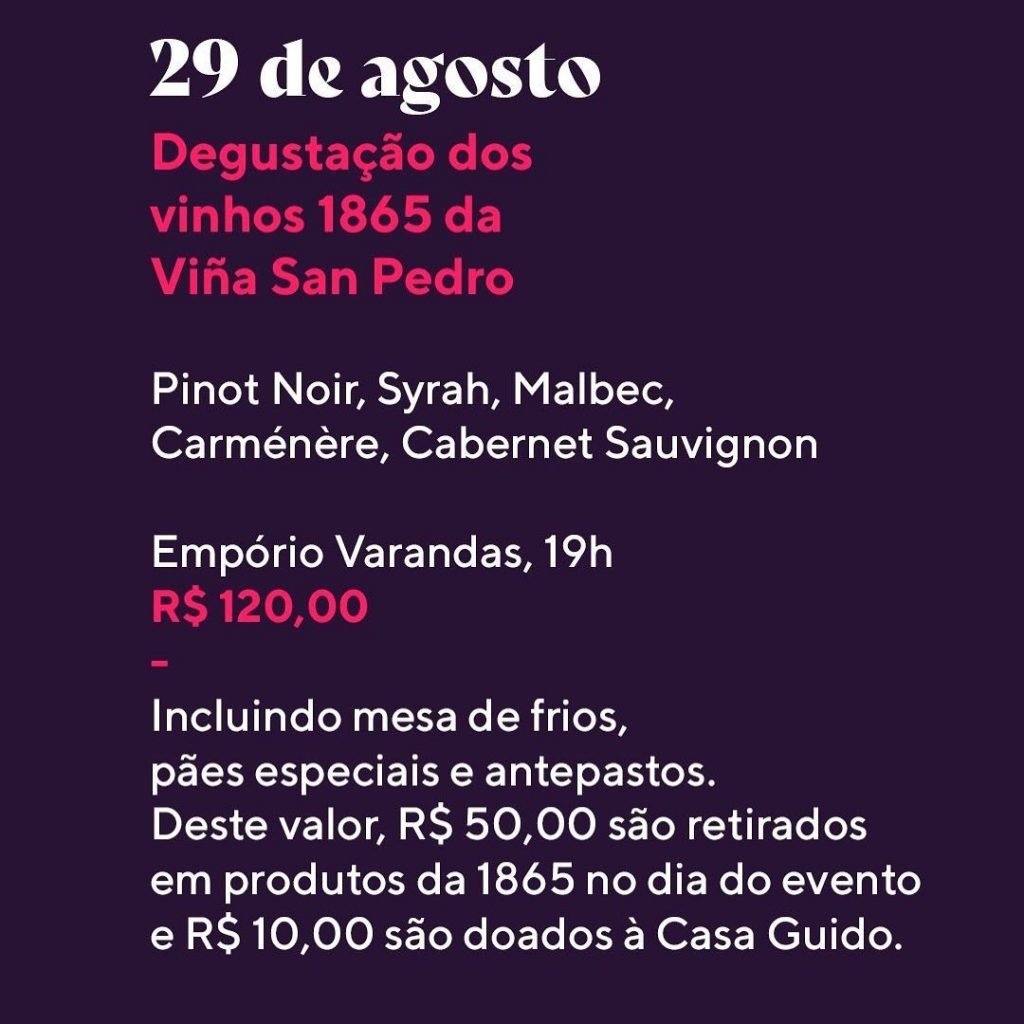 Dia 29, quinta-feira, temos mais uma degustação típica do Varandas! E quem aterrissa por aqui dessa vez é a vinícola San Pedro e seus famosos vinhos 1865 🍷 São só 30 vagas. Informações sobre ingressos pelo telefone 3433 4321.