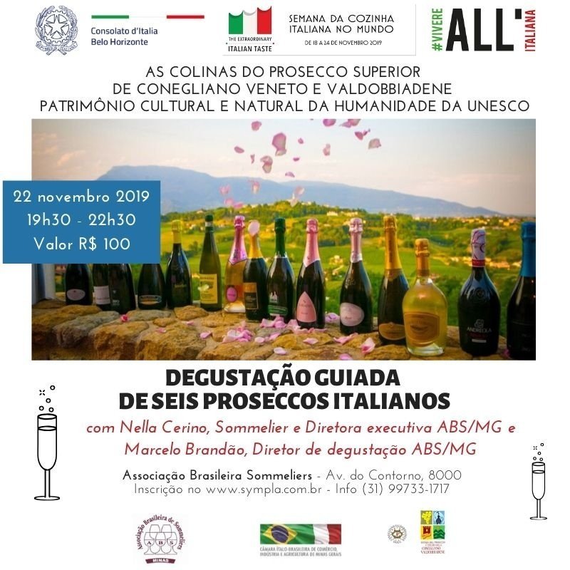 No âmbito da quarta edição da Semana da Cozinha Italiana, acontece em BH a degustação de seis vinhos Prosecco da região, de produção D.O.C.G. (Denominação de Origem Controlada e Garantida). A degustação será conduzida por Nella Cerino e Marcelo Brandão, respectivamente, Diretora-Executiva e Diretor de Degustação da Associação Brasileira de Sommeliers/Minas Gerais.
