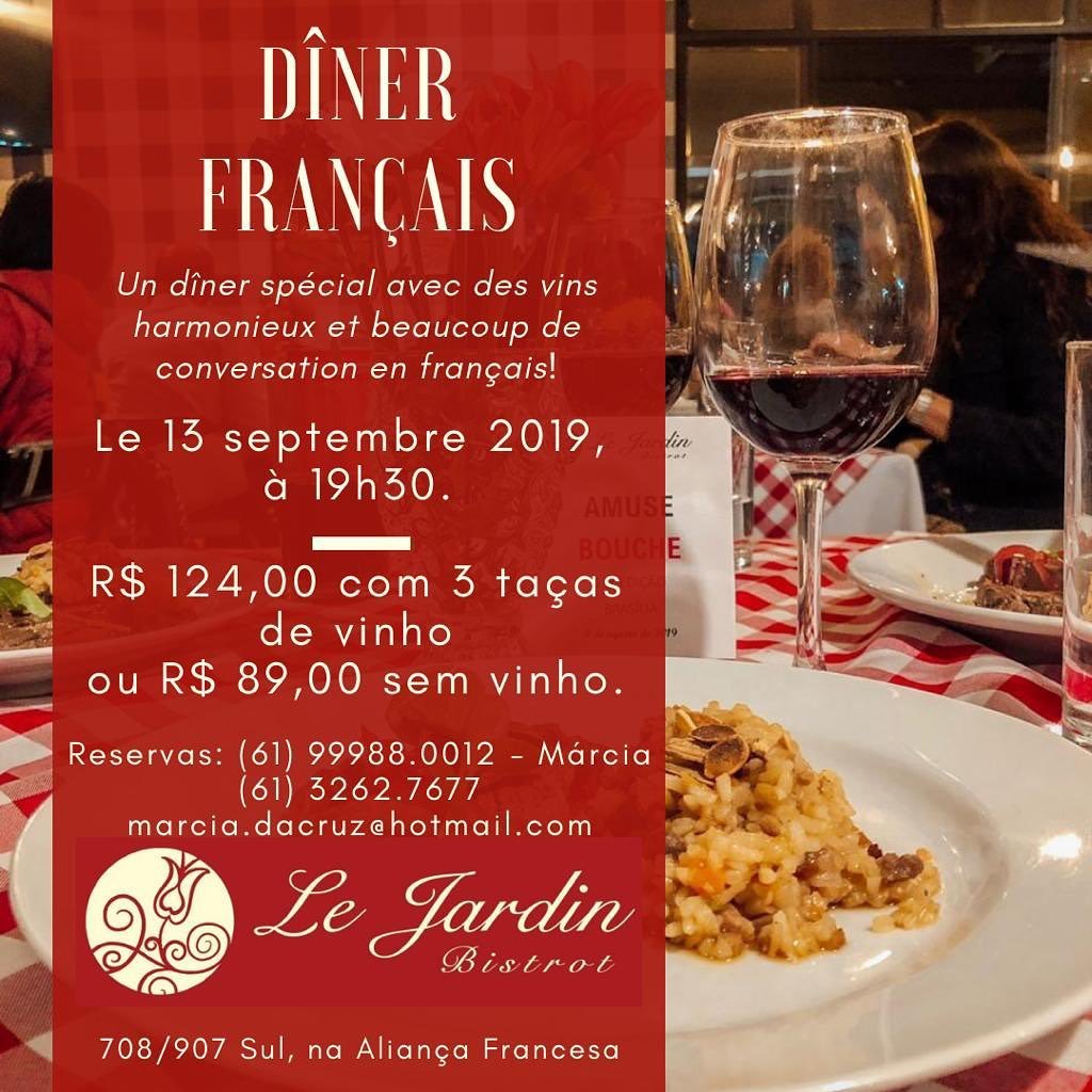 Participe então do Dîner Français no Le Jardin Bistrot, dia 13 de setembro, às 19h30, um jantar especial, menu 4 etapas, com 3 taças de vinhos franceses harmonizadas. 😃🍷🍷