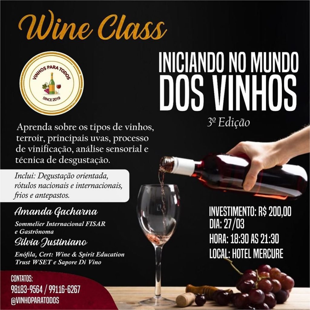 Após o sucesso em duas edições e atendendo a pedidos, a Vinhos Para Todos traz de volta para Manaus a Wine Class “Iniciando no Mundo dos Vinhos” que acontecerá no dia 27 de março, das 18h30 às 22h no Hotel Mercure (Av. Mário Ypiranga, Adrianópolis)