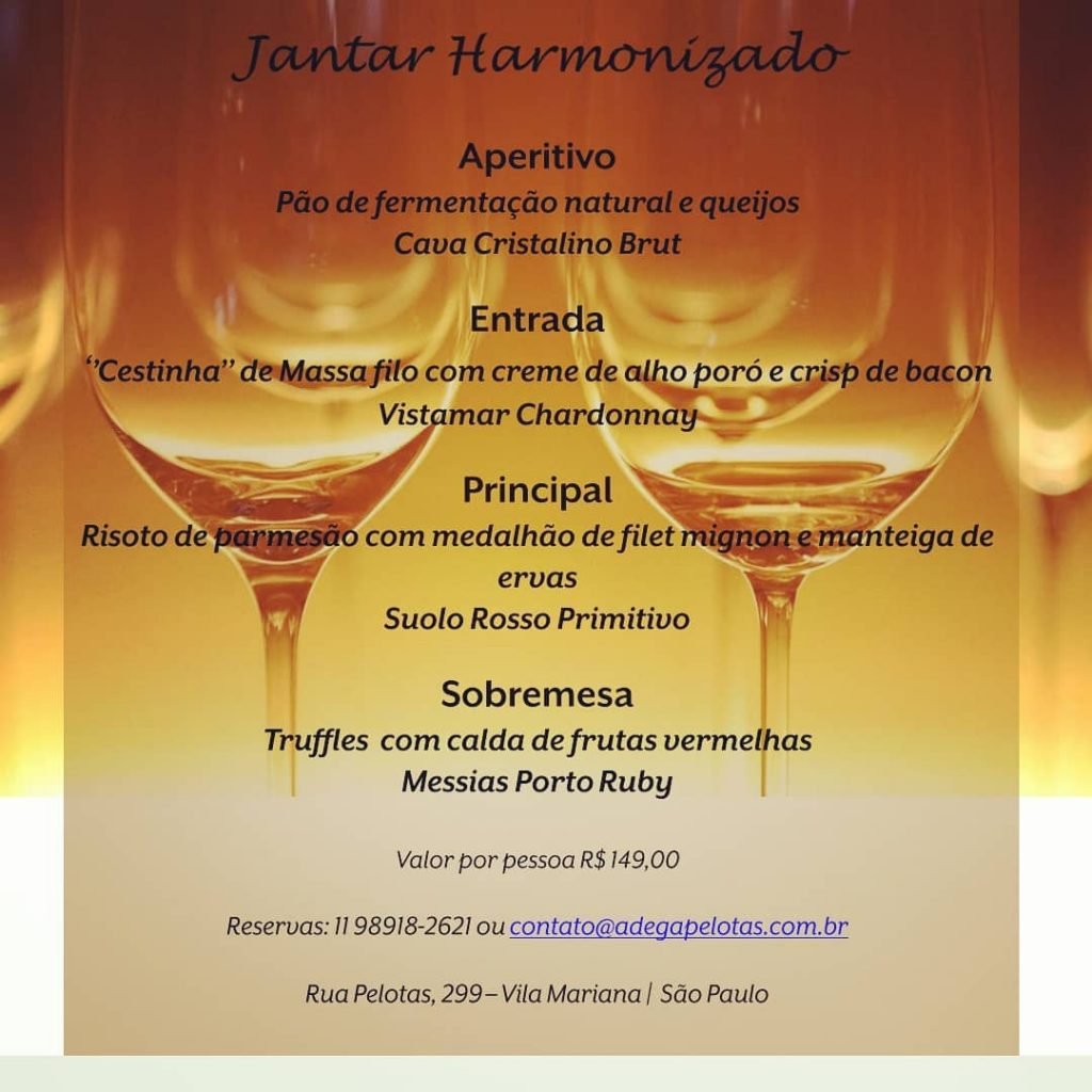1° jantar harmonizado em nossa adega. Preparamos especialmente para você um jantar harmonizado com um menu delicioso, temos somente 15 vagas para essa noite maravilhosa! Data: 25/07 a partir das 19:30