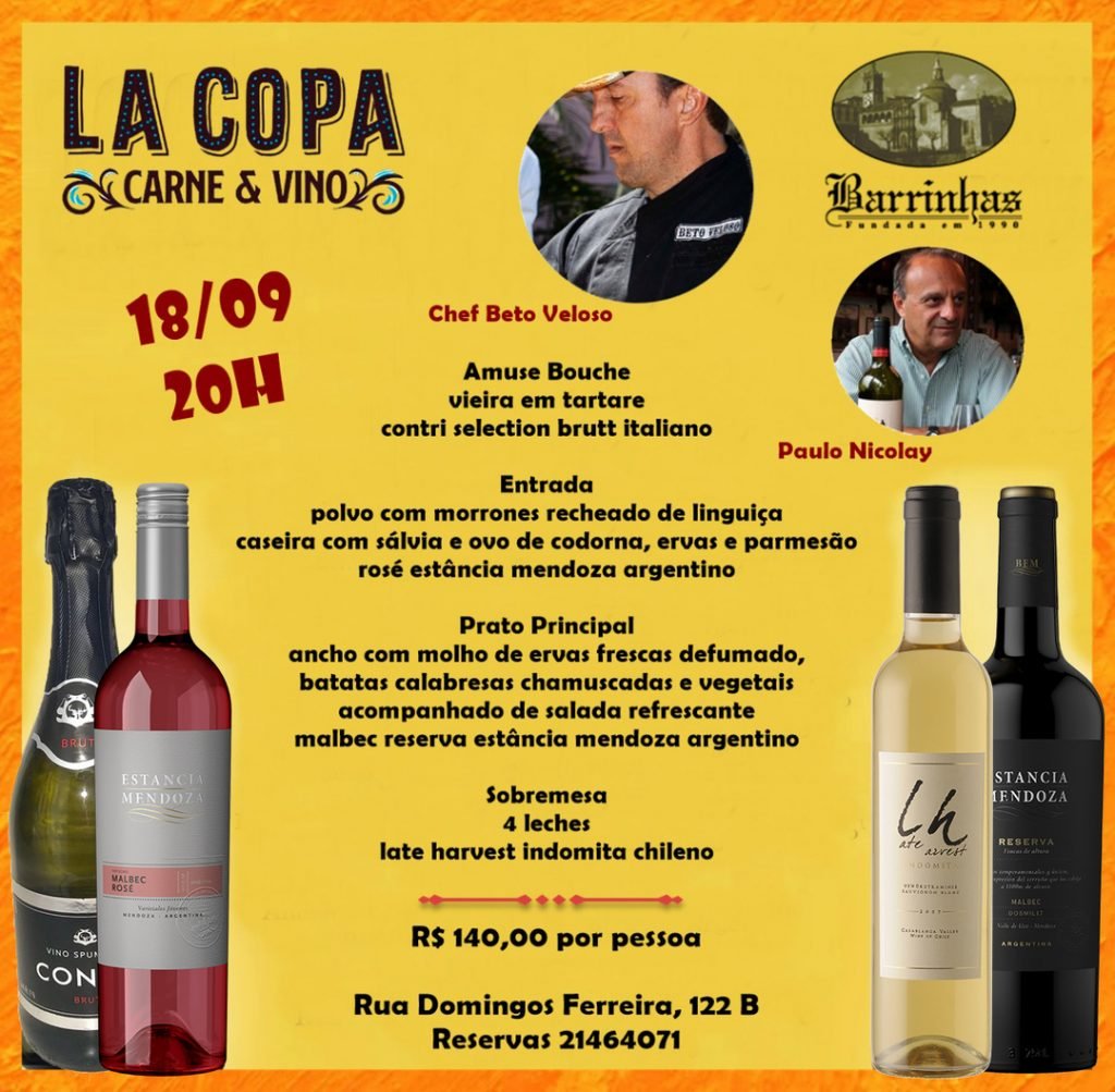 Buscando oferecer uma experiência única aos clientes, o La Copa irá realizar um jantar harmonizado com criações do chef Beto Veloso e rótulos selecionados pelo consultor Paulo Nicolay.