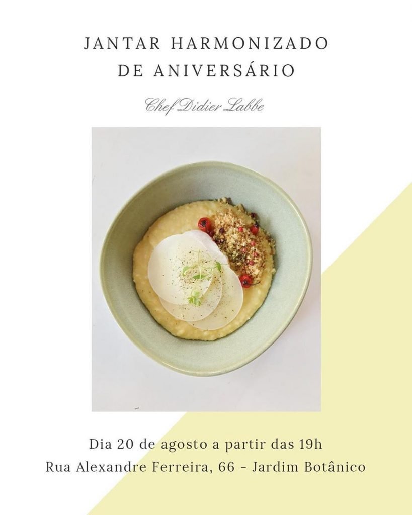 No dia 20 de agosto (terça-feira), a partir das 19h, vamos comemorar um ano da nossa casa com um menu especial criado pelo chef Didier Labbé. 🇫🇷 Faça sua reserva pelo 📞 (21) 3624-7960.