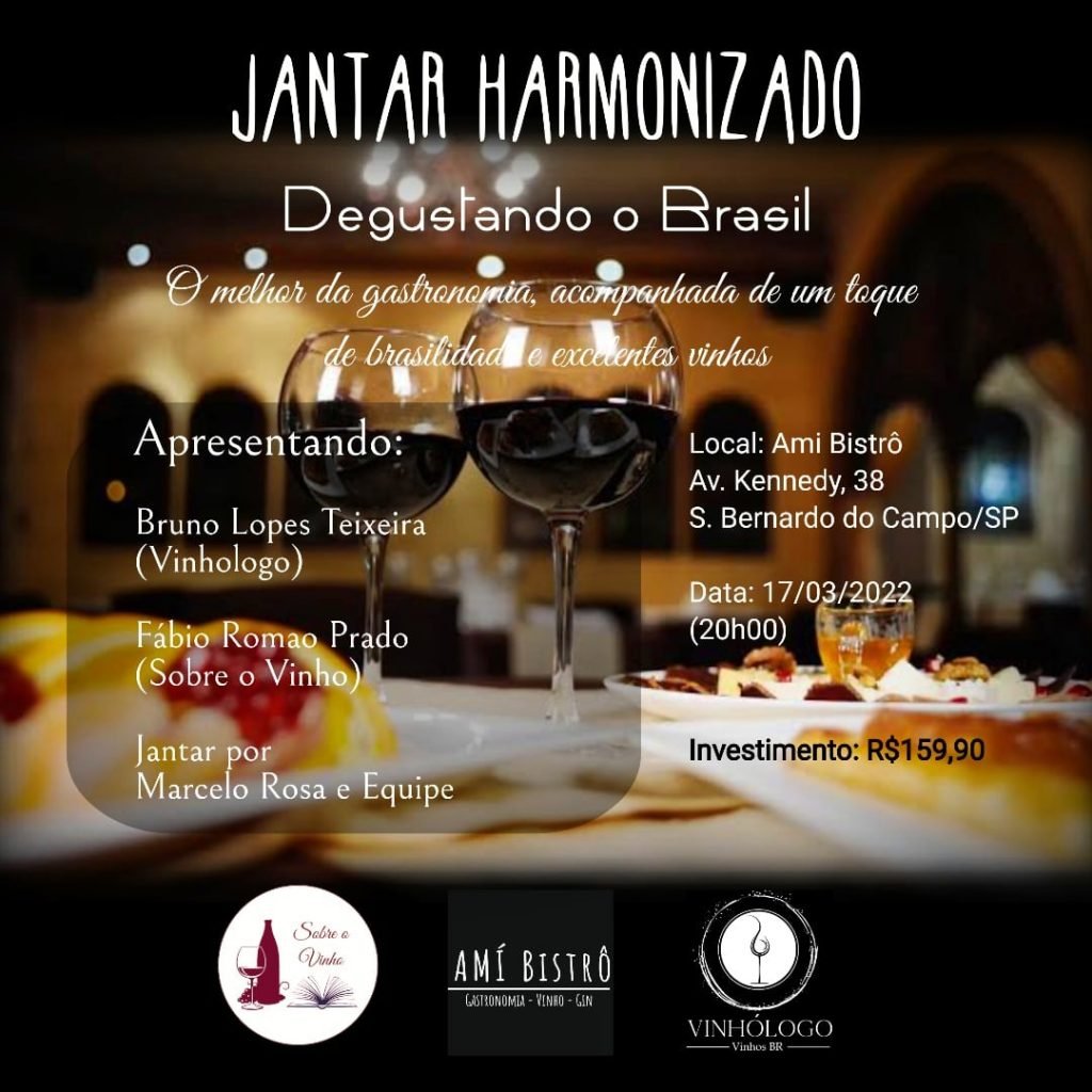 Save the date: 17/03/2022 às 20h00 faremos uma viagem sensorial pelas cores, aromas e sabores tupiniquins através dos inspirados pratos do Restauranteur Marcelo Rosa e sua Equipe, em releituras de clássicos nacionais e internacionais com toques brasilis! Na condução, Fábio Romão Prado (Sobre o Vinho) e Bruno Lopes Teixeira (Vinhólogo), que trarão propostas de harmonização que certamente encantarão os seus sentidos.