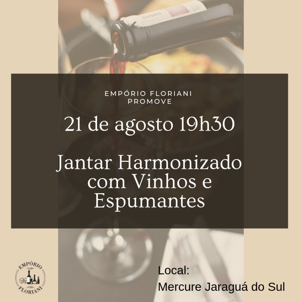 Jantar harmonizado com vinhos e espumantes promovido pelo Empório Floriani. Degustação de quatro rótulos. Reservas no whatsapp 47988151780. Vagas limitadas.