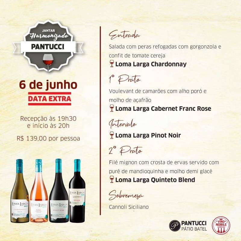JANTAR HARMONIZADO CHILENO NO PANTUCCI PÁTIO BATEL! Venha brindar conosco, com vinhos Loma Larga! O evento acontece dia 6 de junho, quinta-feira, às 20h. O investimento é de R$139,00. Confira o menu e faça já sua reserva (41) 3020-3674. Esse é um evento exclusivo com poucas vagas!