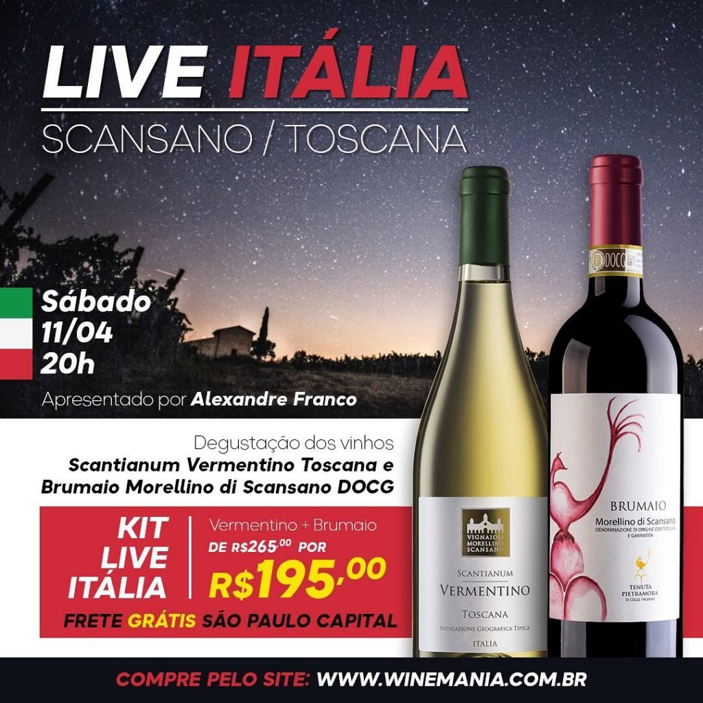 Alexandre Franco vai falar sobre os vinhos Scantianum Vermentino Toscana e Brumaio Morellino di Scanzano DOCG, suas características, harmonização e principalmente sobre a linda região de Scansano na Toscana. .