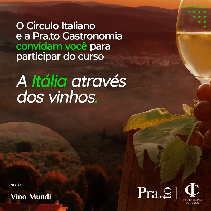 • Em parceria com o Circolo italiano de São Paulo a Pra.to organiza um passeio virtual entre todas as regiões italianas, apresentadas a partir da ligação com o vinho e a terra e que vai mostrar a arte, a história, a gastronomia de cada uma das 20 regiões da península.Cada aula se encerrará com a degustação de um vinho de uma das regiões visitadas.Todas as aulas serão 100% ao vivo e on-line, com interação total e muita descontração.