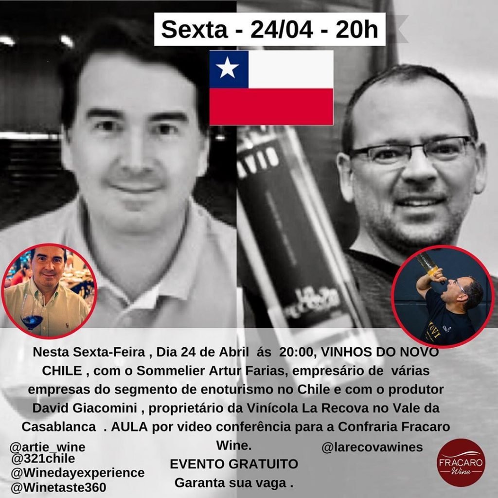 24/04 – 20h , VINHOS DO NOVO CHILE 🇨🇱 com Artur Farias do @artie_wine, empresário de várias empresas do segmento enoturístico no Chile e com David Giacomini , orgulhosamente brasileiro , produtor e proprietário da Vinícola La Recova @larecovawines em Casablanca, Chile.