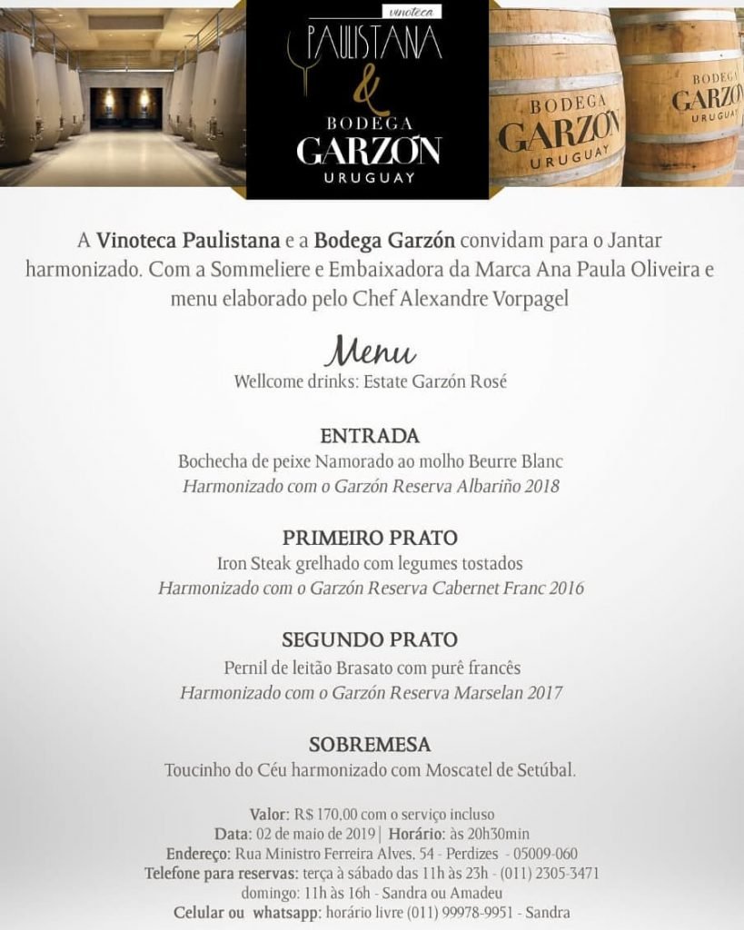 A Vinoteca Paulistana e a Bodega Garzón convidam para nosso Wine Dinner! Uruguai além da Tannat! Será uma noite incrível com o jantar elaborado pelo Chef Alexandre Vorpagel!