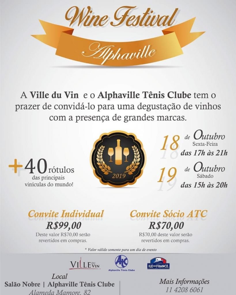 A Ville Du Vin Alphaville Convida você para nossa próxima edição do Wine Festival, que desta vez acontecerá no ATC Tênis Clube, o valor será de R$ 99.00 (Deste valor R$ 70.00 você reverte em compras).Informações e venda de ingresso: 11 4208 – 6061. Ou em nas lojas Ville Du Vin de Alphaville.
