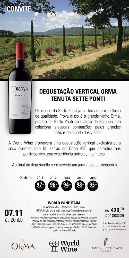 A World Wine, uma das maiores referências na curadoria do vinho no Brasil, promove uma Degustação Vertical especial em torno dos rótulos Orma IGT, da vinícola Tenuta Sette Ponti, no dia 07 de novembro, a partir das 20h, na World Wine Itaim. Com vagas super limitadas, há venda de ingressos antecipados.