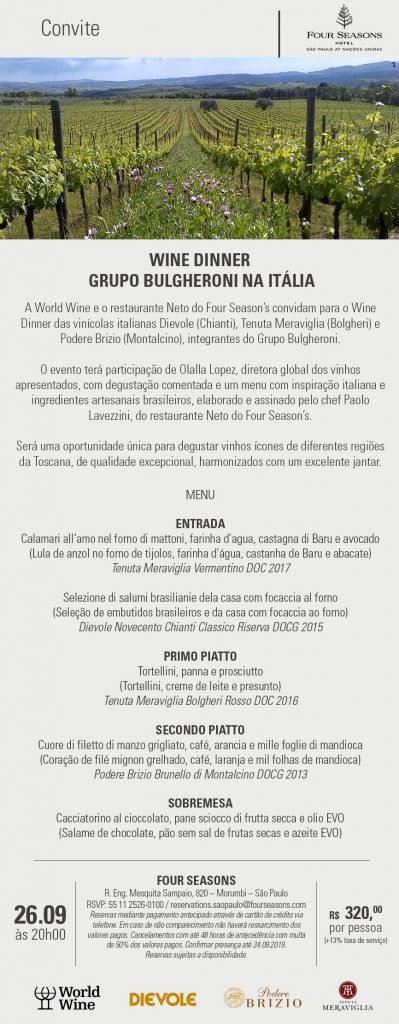 A World Wine e o Restaurante Neto do Four Seasons promovem Wine Dinner com a presença de Olalla Lopez, diretora global das vinícolas do Grupo Bulgheroni que detém as marcas Dievole (Chianti), Tenuta Meravilgia (Bolgheri) e Podere Brizio (Montalcino). Com vagas limitadas, o jantar será harmonizado com quatro rótulos selecionados e menu assinado pelo chef Paolo Lavezzini, dia 26/09, às 20h.